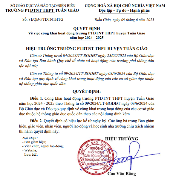 Thông báo về việc điều chỉnh tỷ lệ % chỉ tiêu tuyển sinh vào lớp 10 năm học 2025 - 2026 các xã Khu vực I, huyện Tuần Giáo