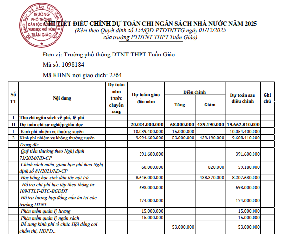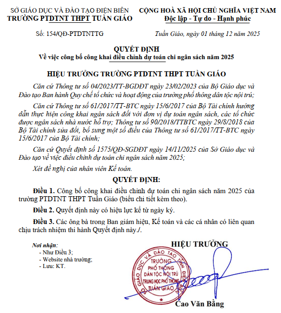 Thông báo về việc điều chỉnh tỷ lệ % chỉ tiêu tuyển sinh vào lớp 10 năm học 2025 - 2026 các xã Khu vực I, huyện Tuần Giáo