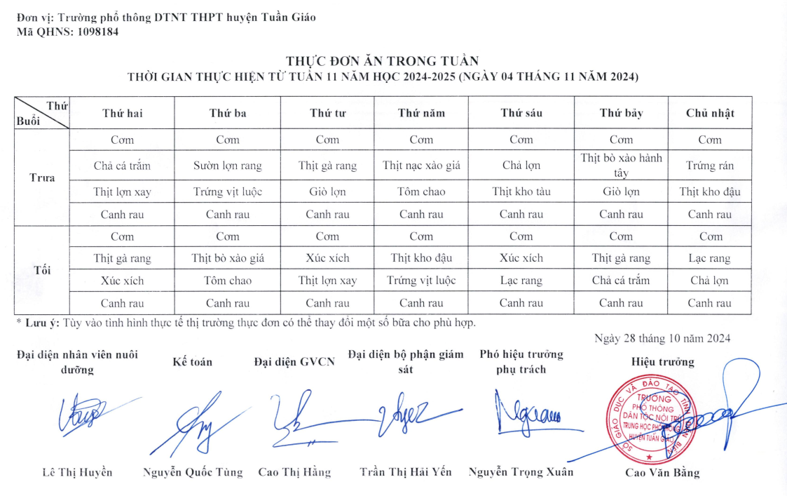 Công khai thực đơn ăn của học sinh (lần 2) năm học 2024-2025