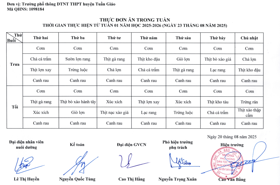 Thực đơn ăn của học sinh năm học 2025-2026 (lần 1)