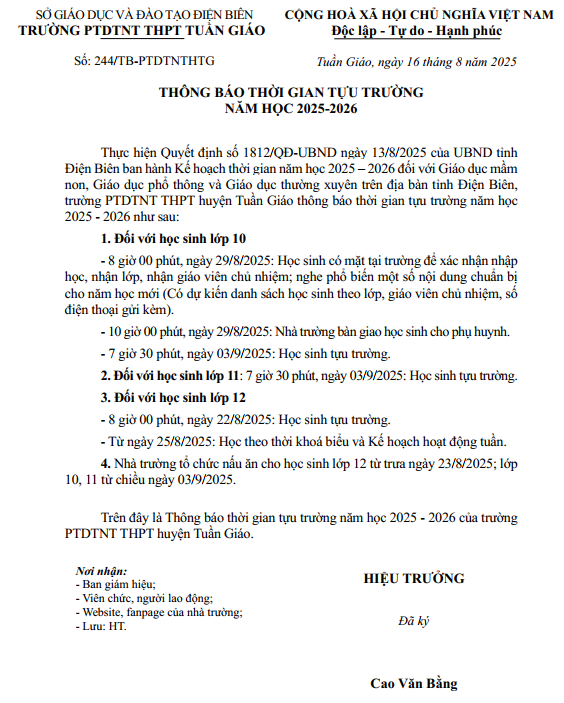 Thông báo về việc điều chỉnh tỷ lệ % chỉ tiêu tuyển sinh vào lớp 10 năm học 2025 - 2026 các xã Khu vực I, huyện Tuần Giáo