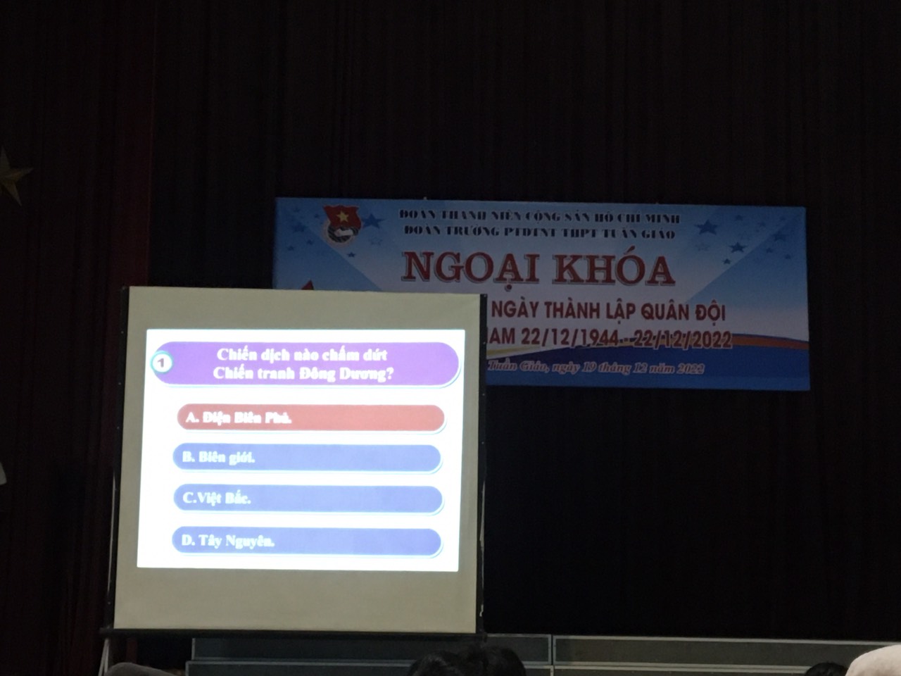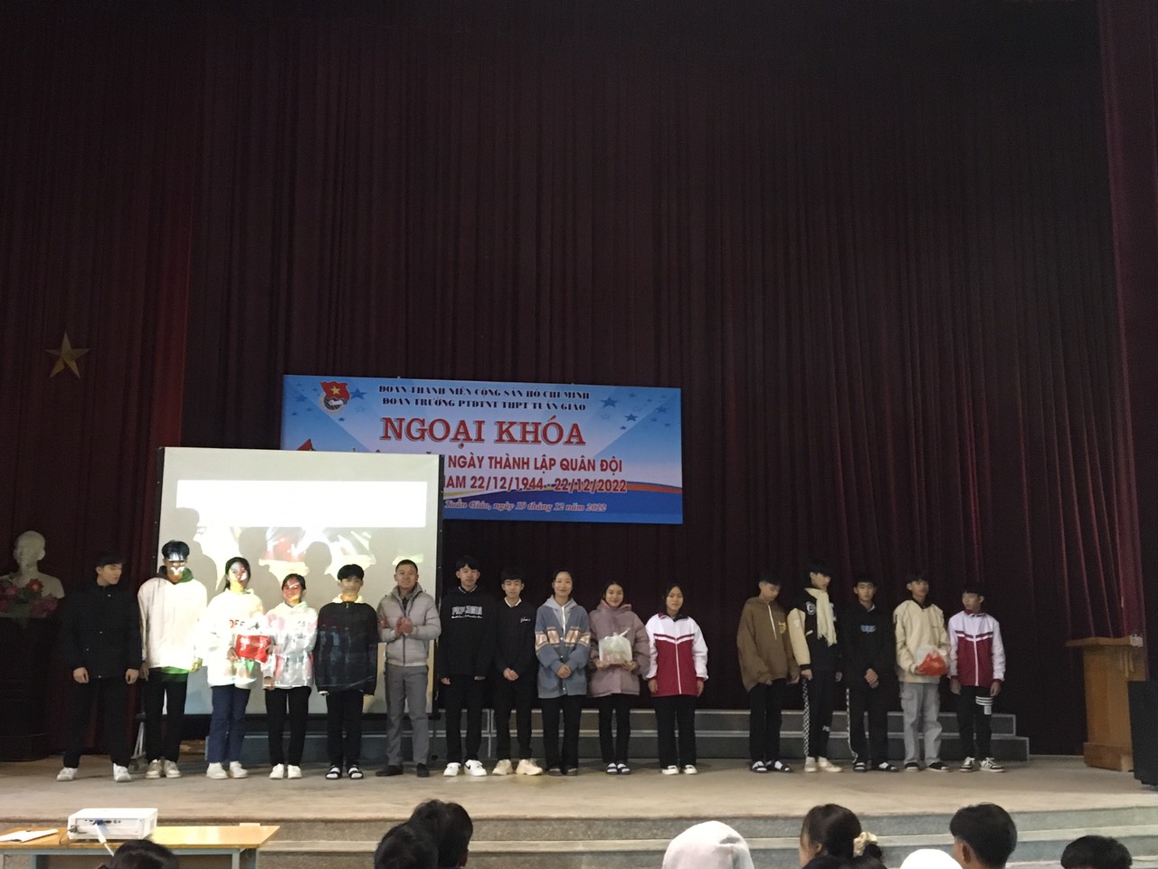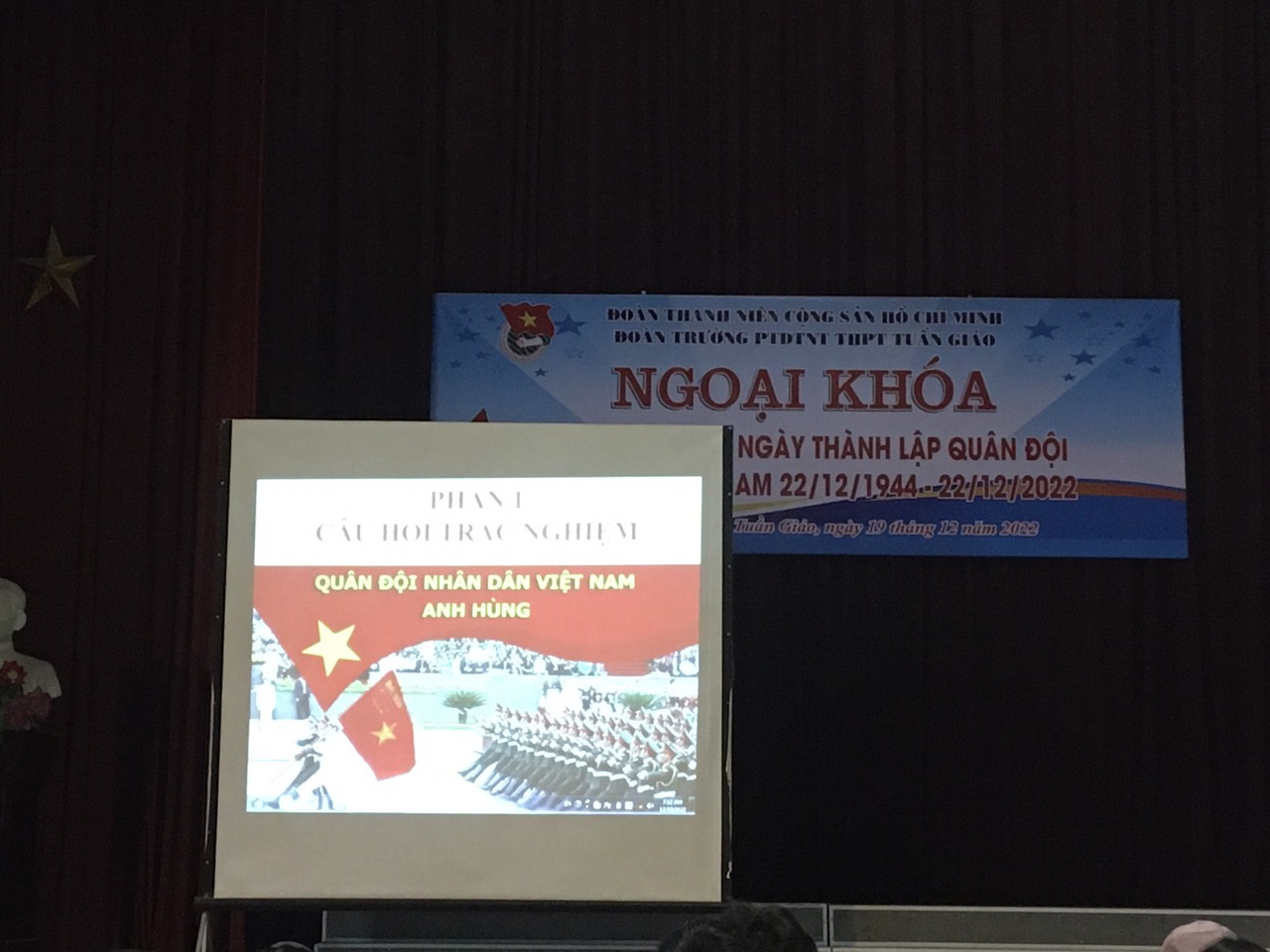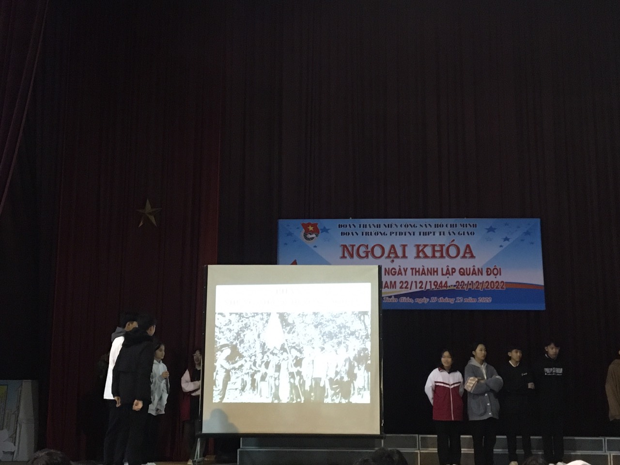 Sáng ngày 19/11/2022, Đoàn TNCS HCM trường PTDTNT THPT Tuần Giáo đã tiến hành tổ chức hoạt động ngoại khóa “Kỉ niệm 78 năm ngày thành lập Quân Đội Nhân Dân Việt Nam 22/12/1944 - 22/12/2022” với sự tham gia của tất cả học sinh trong nhà trường. Buổi ngoại khoá là sân chơi lành mạnh, bổ ích đối với các bạn học sinh thông qua 3 phần thi: