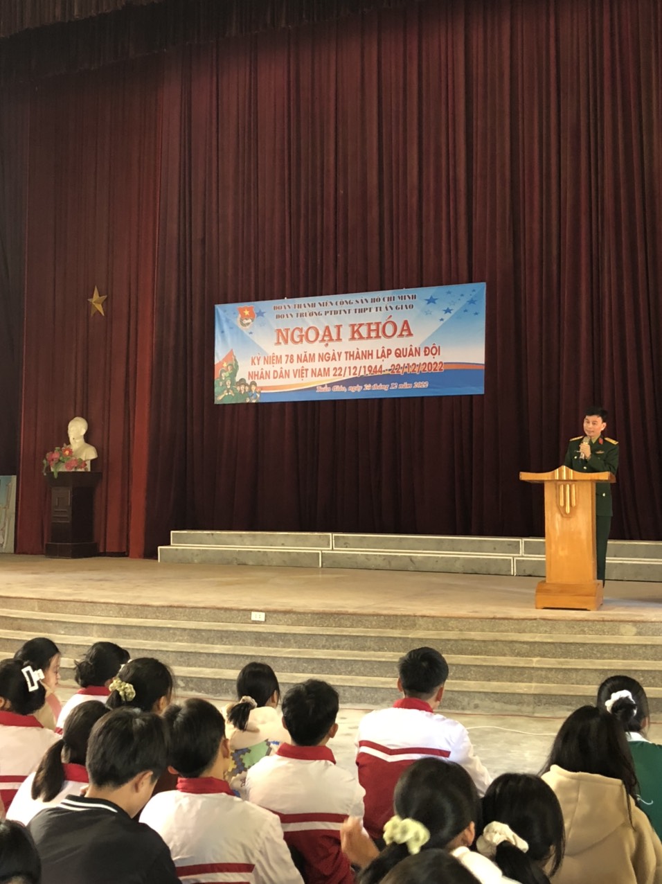 Trong buổi chiều ngày 20/12/2022, Thượng tá Nguyễn Văn Sơn - ủy viên BTV huyện ủy, chỉ huy trưởng BCH quân sự huyện, phó Chủ tịch hội đồng quốc phòng an ninh huyện Tuần Giáo đã tuyên truyền, phổ biến một số kiến thức về tổ chức Quân đội nhân dân Việt Nam tới toàn thể các bạn học sinh trong Nhà trường với một số nội chính: Quân đội nhân dân Việt Nam sau 78 năm xây dựng và phát triển, chiến đấu và trưởng thành. Phát huy truyền thống anh hùng, đẩy mạnh xây dựng nền quốc phòng toàn dân, xây dựng Quân đội nhân dân cách mạng, chính quy, tinh nhuệ, từng bước hiện đại, đáp ứng yêu cầu nhiệm vụ bảo vệ tổ quốc trong tình hình mới. Bên cạnh đó, đồng chí cũng cung cấp rất nhiều thông tin hữu ích, giải đáp những khó khăn, thắc mắc cho các bạn học sinh có nguyện vọng thi vào các trường quân đội trong thời gian tới.