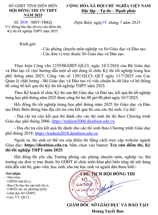 Thông báo địa chỉ tra cứu điểm thi, Kỳ thi tốt nghiệp THPT năm 2025