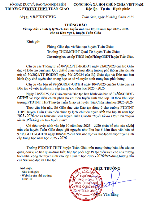Thông báo về việc điều chỉnh tỷ lệ % chỉ tiêu tuyển sinh vào lớp 10 năm học 2025 - 2026 các xã Khu vực I, huyện Tuần Giáo